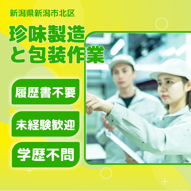 給与詳細 月収例 158,000円 時給例 1,100円 勤務地 新潟県新潟市北区 仕事内容 珍味の製造及び付随する業務