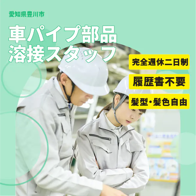 給与詳細 月収例 260,000円 日給例 13,000円 勤務地 愛知県豊川市 仕事内容 【車パイプ部品溶接スタッフ】