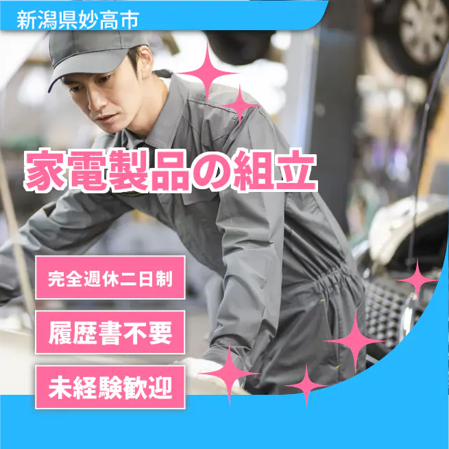 給与詳細 月収例 196,000円 時給例 1,061円 勤務地 新潟県妙高市 仕事内容 嬉しい日勤固定!有名ブランドの家電組立作業