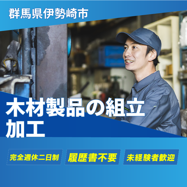 給与詳細 月収例 234,000円 時給例 1,200円 勤務地 群馬県伊勢崎市 仕事内容 木材製品の組立作業