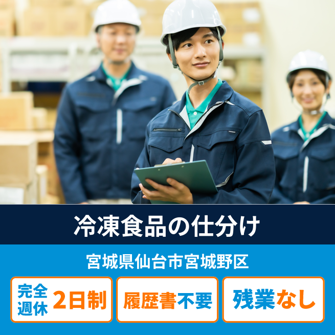 給与詳細 月収例 210,000円 日給例 10,500円 勤務地 宮城県仙台市宮城野区 仕事内容 冷凍倉庫内で業務用食品のピッキングや仕分けのお仕事