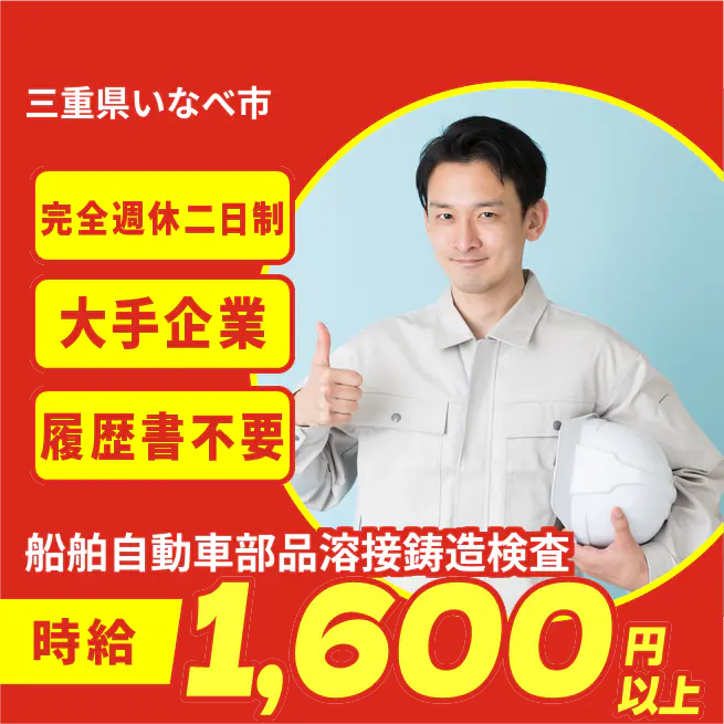 給与詳細 月収例 240,000円 時給例 1,600円 勤務地 三重県いなべ市 仕事内容 【船舶自動車部品溶接鋳造検査】