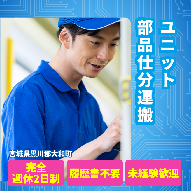 給与詳細 月収例 187,500円 時給例 1,250円 勤務地 宮城県黒川郡大和町 仕事内容 【ユニット部品仕分運搬】