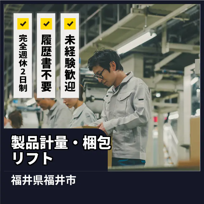給与詳細 月収例 195,000円 時給例 1,250円 勤務地 福井県福井市 仕事内容 【業務内容】