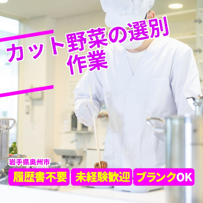 給与詳細 月収例 160,000円 時給例 1,060円 勤務地 岩手県奥州市 仕事内容 野菜の洗浄やカット、カットされた野菜の選別作業