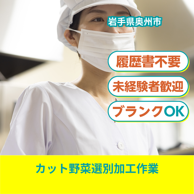 給与詳細 月収例 160,000円 時給例 1,060円 勤務地 岩手県奥州市 仕事内容 【カット野菜選別加工作業】