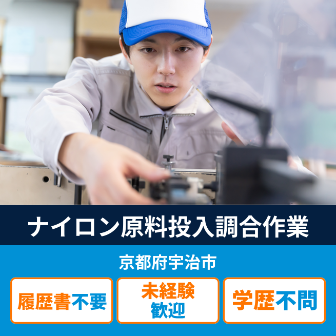 給与詳細 月収例 302,250円 日給例 12,400円 勤務地 京都府宇治市 仕事内容 【ナイロン原料投入調合作業】