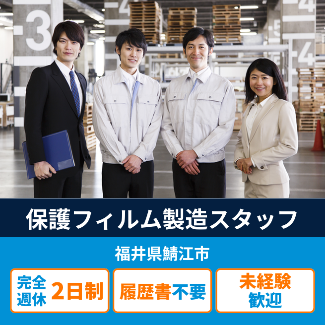 給与詳細 月収例 250,000円 日給例 12,500円 勤務地 福井県鯖江市 仕事内容 【保護フィルム製造スタッフ】