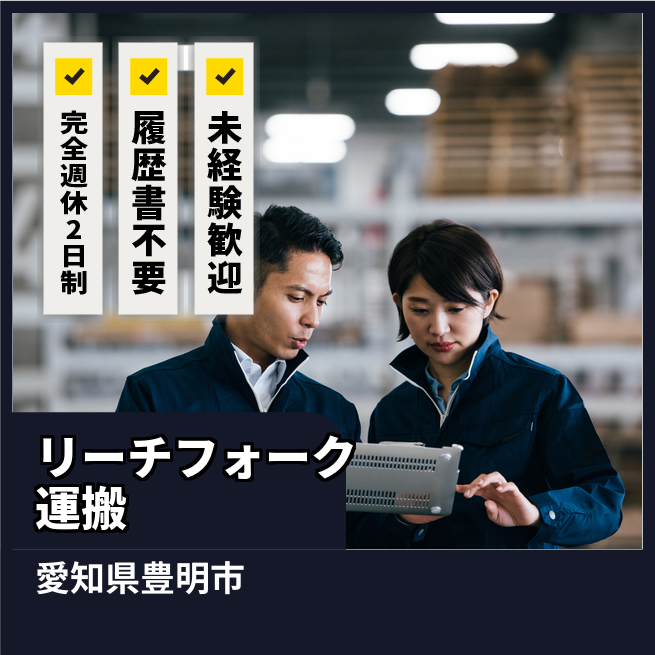 給与詳細 月収例 257,400円 日給例 10,560円 勤務地 愛知県豊明市 仕事内容 自動車部品、繊維製造機械部品をフォークリフトを使用して運搬作業。自動車部品の手作業での運搬作業、自動車部品の梱包、ピッキング、仕分け作業。