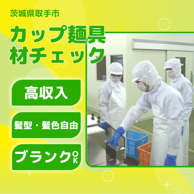給与詳細 月収例 90,000円 時給例 1,500円 勤務地 茨城県取手市 仕事内容 【業務内容】カップ麺の具材検査とトッピング作業