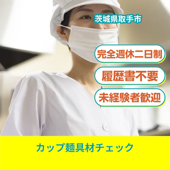 給与詳細 月収例 90,000円 時給例 1,500円 勤務地 茨城県取手市 仕事内容 【業務内容】カップ麺の具材検査とトッピング作業