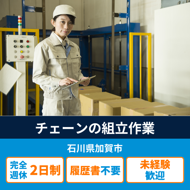 給与詳細 月収例 230,000円 日給例 11,500円 勤務地 石川県加賀市 仕事内容 ≪チェーンの組立≫ 手作業でパーツを順番通りにはめていき、機械にセットして組み立てる作業です。 フォークリフト・玉掛け・クレーンの資格をお持ちの方はご経験を活かしてお仕事して頂けます。 20~30代の方多数活躍中の職場です!