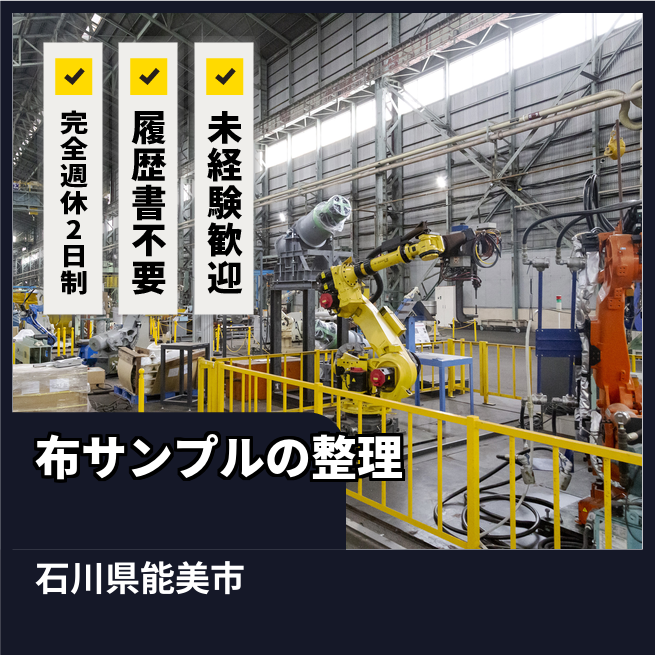 給与詳細 月収例 185,000円 時給例 1,180円 勤務地 石川県白山市 仕事内容 布製品の検査をメインに行っていただきます。検査機で流れてくる布を目視で検査し、シミやほつれ、色ムラがないかチェックします。付随業務として布サンプル制作と布の整理業務も行っていただく可能性があります。名刺サイズの布を切り、台紙に貼り付けてお客様にお見せするサンプルを作っていただきます。
