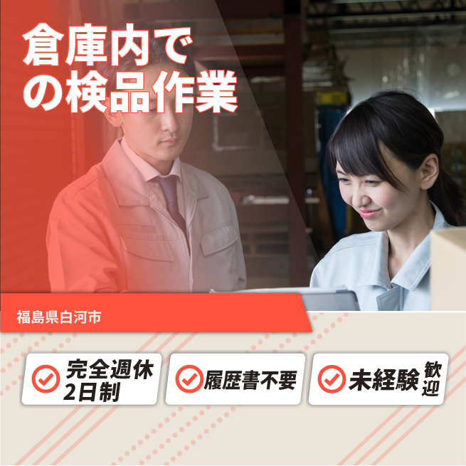 給与詳細 月収例 253,500円 日給例 10,400円 勤務地 福島県白河市 仕事内容 倉庫内で自動車用タイヤの出荷作業を担当していただきます。具体的には、タイヤの投入・検品、積下ろし(手荷役中心)、および入出庫に伴う付帯作業全般を行います。フォークリフト資格をお持ちの方は、必要に応じてリフト作業(約2割/リーチタイプ)をお願いする可能性があります。出荷作業はリフトマンと積込担当の2人1組で行い、1台あたりの積込作業はおよそ1時間程度かかります。
