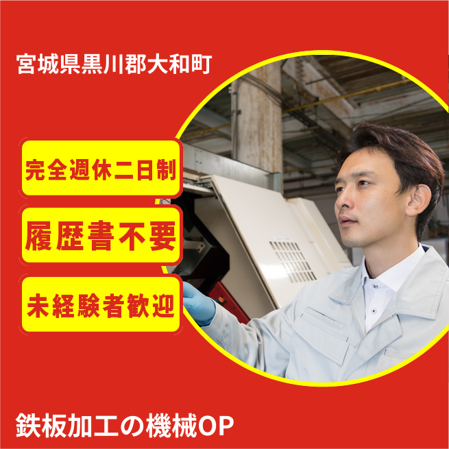 給与詳細 月収例 208,000円 日給例 10,400円 勤務地 宮城県黒川郡大和町 仕事内容 金属製品を旋盤にセットし、ボタンを押すだけの簡単な作業です。