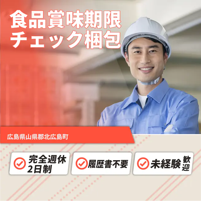 給与詳細 月収例 197,000円 時給例 1,200円 勤務地 広島県山県郡北広島町 仕事内容 【食品賞味期限チェック梱包】