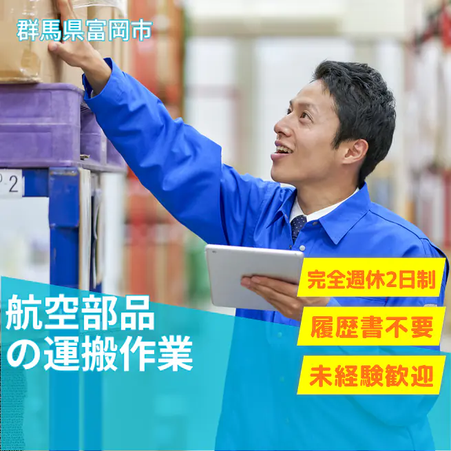 給与詳細 月収例 234,000円 時給例 1,200円 勤務地 群馬県富岡市 仕事内容 【業務内容】航空部品の梱包・運搬に関する作業