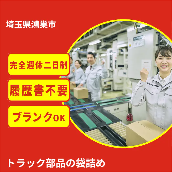 給与詳細 月収例 240,000円 日給例 12,000円 勤務地 埼玉県鴻巣市 仕事内容 電気機器製品の組立・検査・梱包などをお願いします!丁寧に終えてもらえるので安心してスタートできます☆