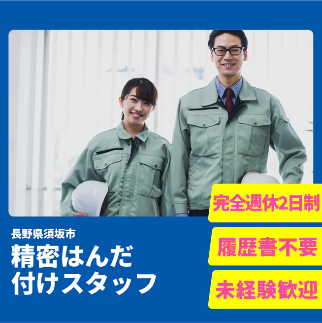 給与詳細 月収例 195,000円 時給例 1,300円 勤務地 長野県須坂市 仕事内容 【精密はんだ付けスタッフ】