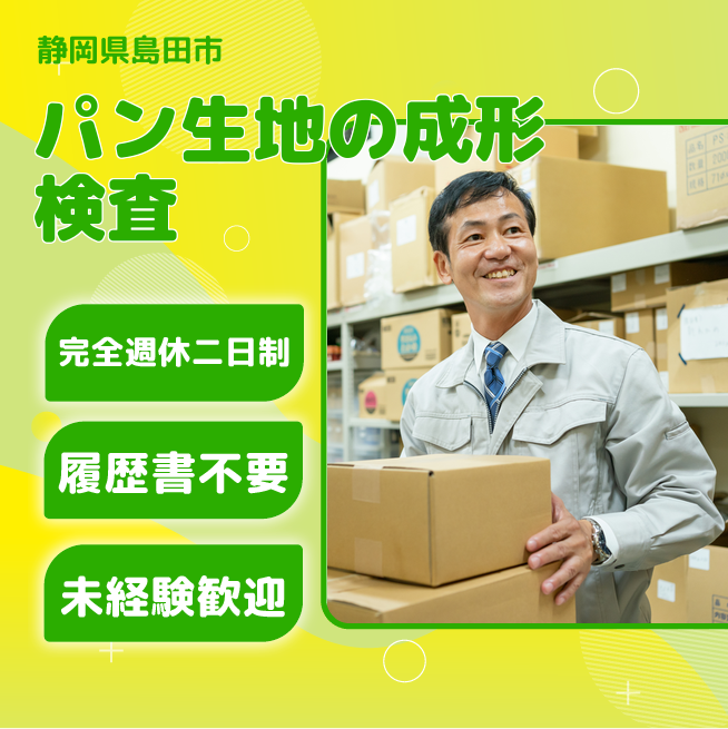 給与詳細 月収例 200,000円 日給例 10,000円 勤務地 静岡県島田市 仕事内容 ラインで流れてくるパン生地の成形・検査、開梱、箱詰め作業、