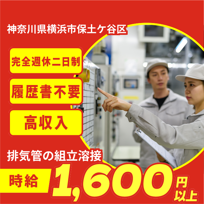 給与詳細 月収例 312,000円 時給例 1,600円 勤務地 神奈川県横浜市保土ケ谷区 仕事内容 空調に使われる製品の排気口や排気管の組立、溶接業務