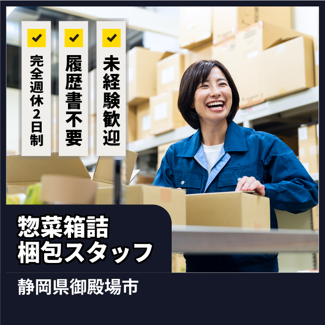 給与詳細 月収例 247,650円 日給例 10,160円 勤務地 静岡県御殿場市 仕事内容 【惣菜箱詰梱包スタッフ】
