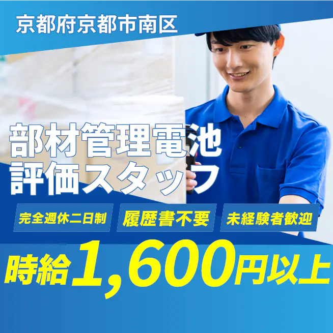 給与詳細 月収例 270,000円 時給例 1,600円 勤務地 京都府京都市南区 仕事内容 【部材管理電池評価スタッフ】