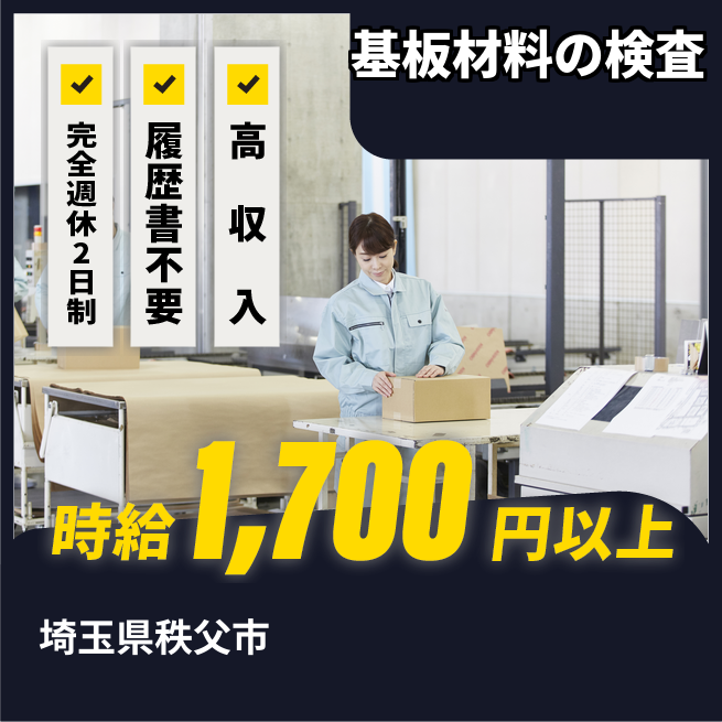 給与詳細 月収例 331,500円 時給例 1,700円 勤務地 埼玉県秩父市 仕事内容 半導体分野に使用される基板材料のセットや検査を行っていただきます。