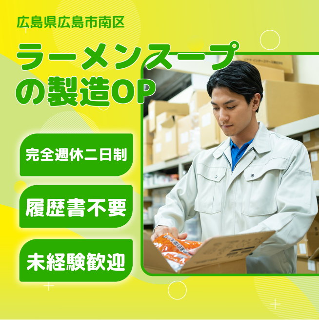 給与詳細 月収例 250,000円 日給例 12,500円 勤務地 広島県広島市南区 仕事内容 冷暖房が効いた工場での、ラーメンスープの製造。