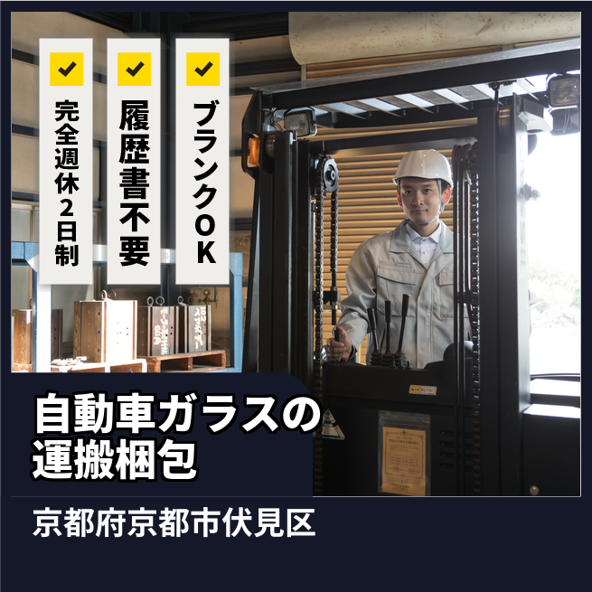 給与詳細 月収例 273,000円 日給例 11,200円 勤務地 京都府京都市伏見区 仕事内容 自動車用ガラスの運搬業務。