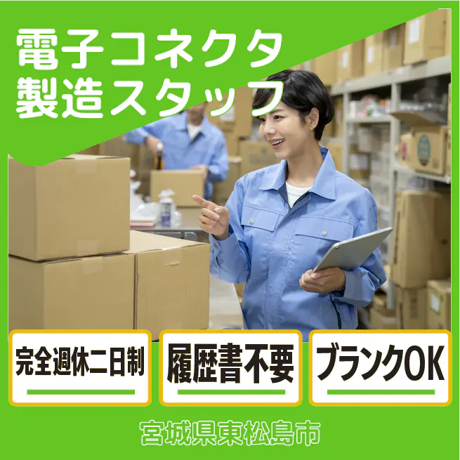 給与詳細 月収例 250,000円 日給例 12,500円 勤務地 宮城県東松島市 仕事内容 【電子コネクタ製造スタッフ】