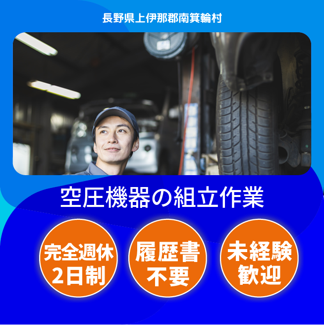給与詳細 月収例 186,000円 時給例 1,320円 勤務地 長野県上伊那郡南箕輪村 仕事内容 【業務内容】製品(空気圧機器)の組立、検査、梱包作業
