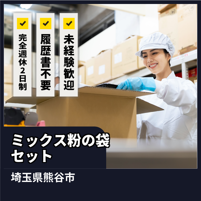 就業場所:全国(派遣先)/就業範囲:派遣先業務全般(詳細は就業条件明示書で明示する) ミックス粉製造
