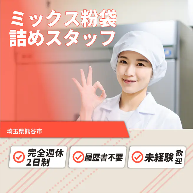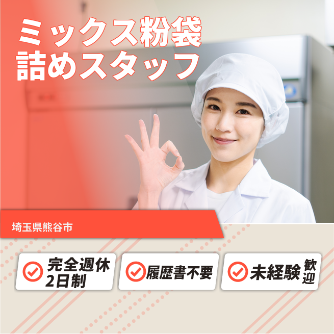 給与詳細 月収例 177,000円 時給例 1,180円 勤務地 埼玉県熊谷市 仕事内容 【ミックス粉袋詰めスタッフ】