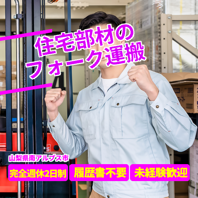 給与詳細 月収例 224,000円 日給例 11,200円 勤務地 山梨県南アルプス市 仕事内容 ・住宅部材(鋼材)フォークでの取り廻し作業(重量物一部手作業)