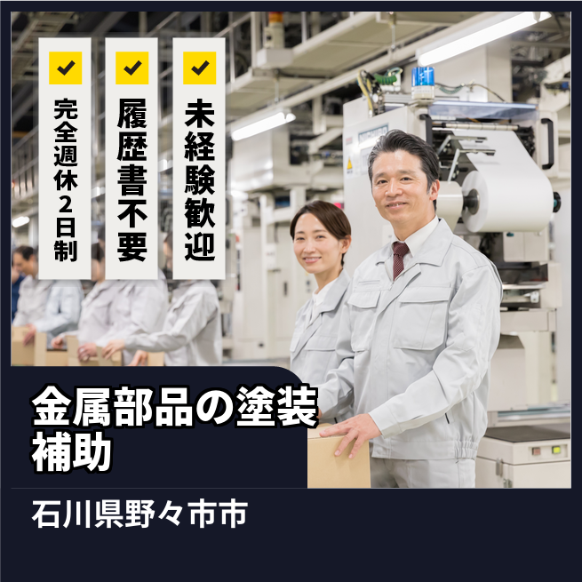 給与詳細 月収例 201,200円 日給例 10,060円 勤務地 石川県白山市 仕事内容 塗装前準備のお仕事です。塗装前の金属製品を洗浄・拭き上げを行っていただきます。10~20kgをずらすことがあります。