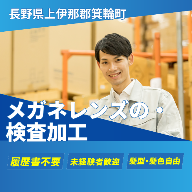 給与詳細 月収例 263,250円 日給例 10,800円 勤務地 長野県上伊那郡箕輪町 仕事内容 メガネ用プラスチックレンズを製造・加工するお仕事です。加工、レンズの染色、色や形の最終検査、出荷などたくさんの工程があります。部署によってシフトが異なるため、出れる時間帯によって部署が決まります。