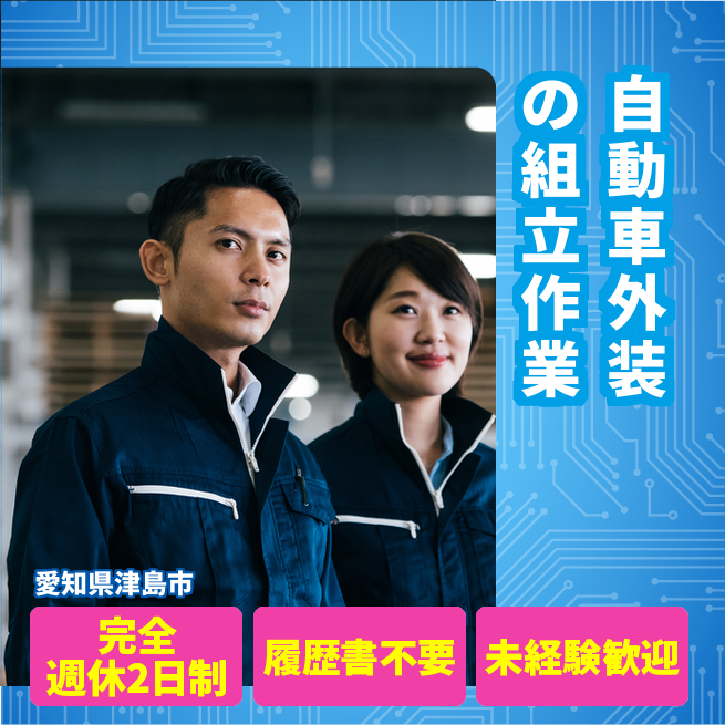 給与詳細 月収例 230,000円 日給例 11,500円 勤務地 愛知県津島市 仕事内容 自動車部品の組立作業(自動車外装部品の組立