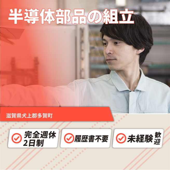 給与詳細 月収例 200,000円 日給例 10,000円 勤務地 滋賀県犬上郡多賀町 仕事内容 半導体製造マシンの部品を組たてるお仕事です。