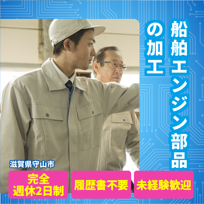給与詳細 月収例 250,000円 日給例 12,500円 勤務地 滋賀県守山市 仕事内容 船舶用エンジン部品の「機械オペレーター」を担当していただきます。