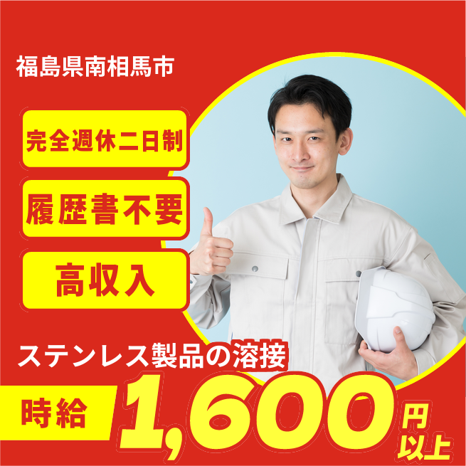 給与詳細 月収例 270,000円 時給例 1,650円 勤務地 福島県南相馬市 仕事内容 ステンレスの加工、溶接、検査、その他付随する作業。