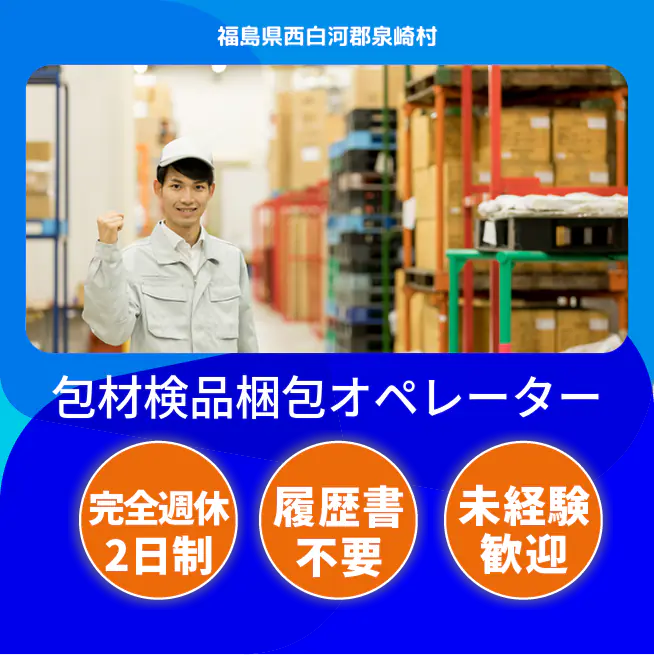 給与詳細 月収例 230,000円 日給例 11,500円 勤務地 福島県西白河郡泉崎村 仕事内容 【包材検品梱包オペレーター】
