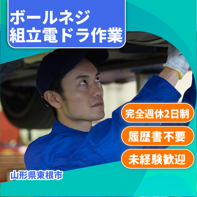 給与詳細 月収例 190,000円 時給例 1,080円 勤務地 山形県東根市 仕事内容 【ボールネジ組立電ドラ作業】