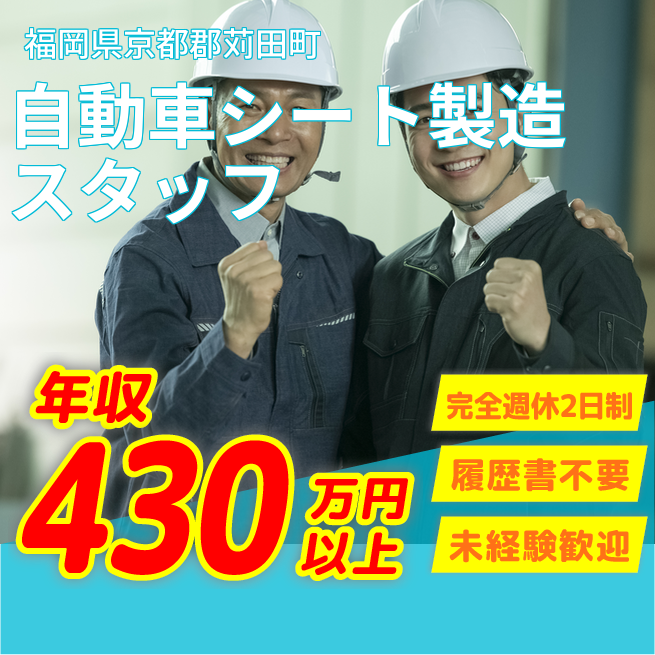 給与詳細 年収例 4,440,000円 月収例 370,000円 勤務地 福岡県京都郡苅田町 仕事内容 自動車の座席(シート)をつくるお仕事です。