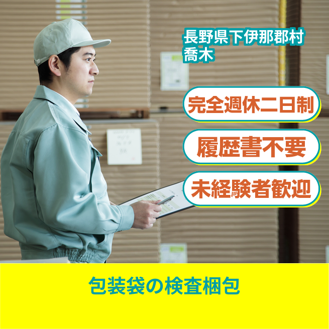 給与詳細 月収例 150,000円 時給例 1,120円 勤務地 長野県下伊那郡喬木村 仕事内容 大手ファストフード店の食品包装紙やコンビニのホットスナックを入れる袋の製造のお仕事です。