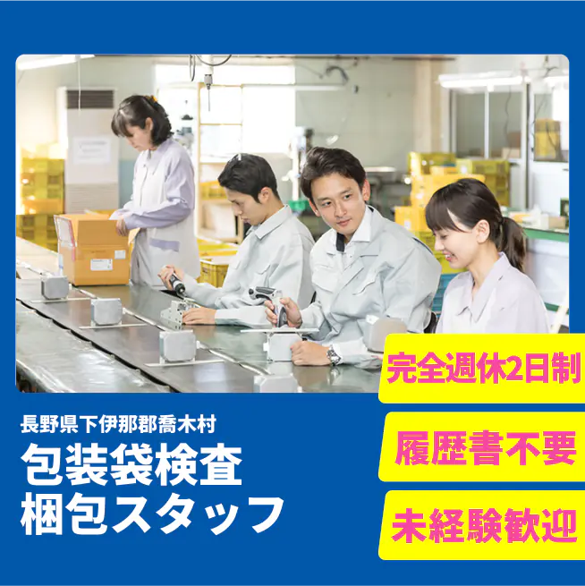 給与詳細 月収例 150,000円 時給例 1,120円 勤務地 長野県下伊那郡喬木村 仕事内容 【包装袋検査梱包スタッフ】