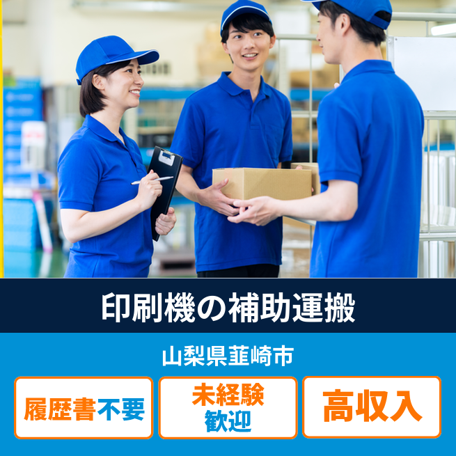 給与詳細 月収例 180,000円 時給例 1,400円 勤務地 山梨県甲府市 仕事内容 印刷機オペレータ・印刷機長の補助作業・用紙の運搬、機械へのセット・印刷物の運搬・その他付随する業務