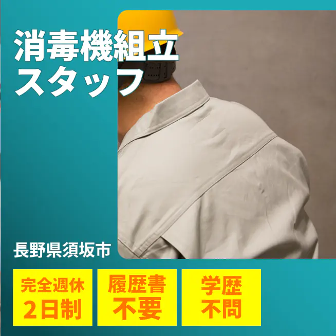 給与詳細 月収例 208,000円 日給例 10,400円 勤務地 長野県須坂市 仕事内容 【消毒機組立スタッフ】