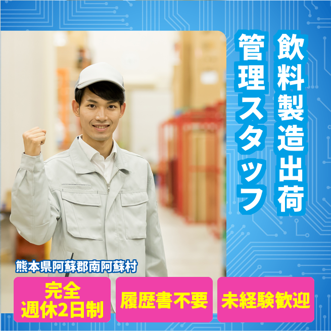 給与詳細 月収例 200,000円 日給例 10,000円 勤務地 熊本県阿蘇郡南阿蘇村 仕事内容 【飲料製造出荷管理スタッフ】
