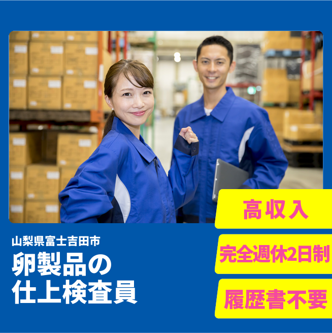 給与詳細 月収例 292,500円 日給例 12,000円 勤務地 山梨県富士吉田市 仕事内容 女性多数活躍★未経験OK!残業少なめで安心勤務/履歴書不要